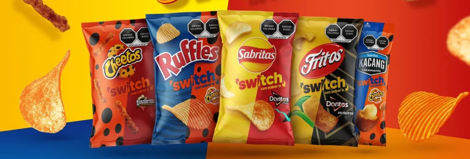 En su tercera entrega, Switch de sabores regresa más disruptiva que nunca con combinaciones que descolocan hasta que las pruebas: Doritos con sabor a Sabritas Adobadas, Sabritas con sabor a Cheetos Poffs, Ruffles con sabor a Fritos Chorizo, Churrumais con sabor a Cheetos Colmillos, Tostitos con sabor a Ruffles Queso, Cheetos con sabor a Ruffles Mega Crunch, Kacang con sabor a Sabritas Receta Crujiente Jalapeño.
