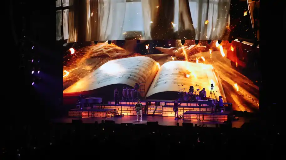 El espectáculo se apoyó en una producción visual correcta: pantallas laterales, una pantalla central alargada y un diseño de luces que acompañó con dinamismo cada interpretación. La banda, integrada por ocho músicos, aportó solidez a la ejecución instrumental, con secciones de percusión, metales, cuerdas y teclados que respaldaron el recorrido musical.