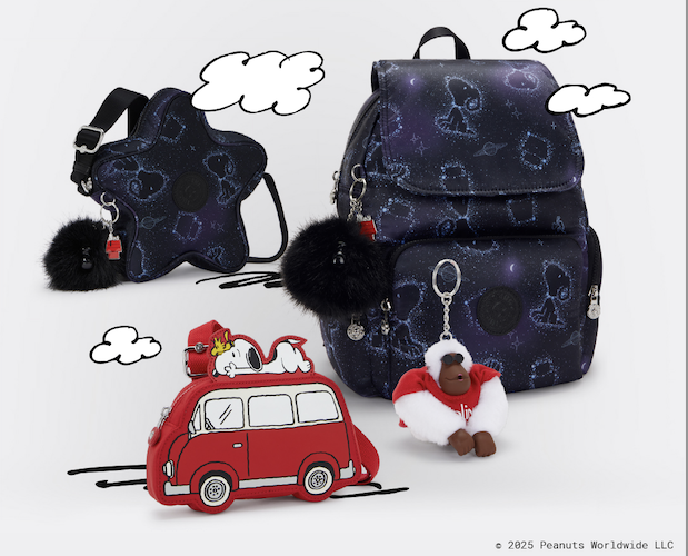 En honor al 75 aniversario de Peanuts, Kipling y Snoopy se reencuentran en una colaboración de ensueño y muy celestial, que incluye nueve estilos divertidos.