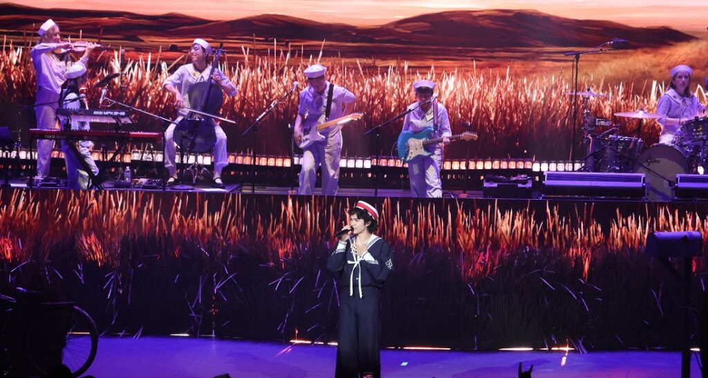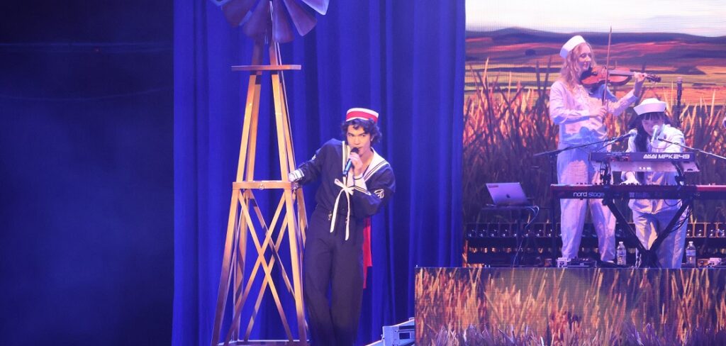 Todo esto se desarrolla en un entorno onírico que a veces evoca imágenes de El Mago de Oz, con una producción escénica exuberante y acogedora, conceptualizada por el propio cantante en colaboración con el director creativo y escenógrafo Benjamin Dupont de Moment Factory, crea un entorno teatral panorámico que permite que la atmósfera del espectáculo florezca.