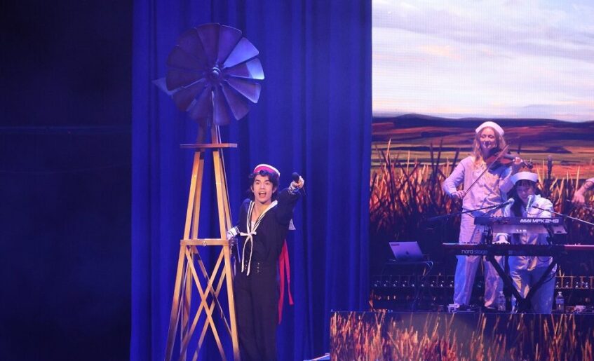 El escenario era a partes iguales concierto y paso a la adultez, un trozo de césped se extendía por el escenario, salpicado de nubes, y una cama que Gray luego desenrollaba para cambiarse de ropa, poniéndose un pijama a mitad del espectáculo.