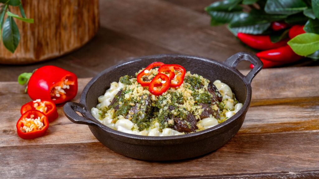 Peppers Cali-ente sirve macarrones con queso ramen enriquecidos con crumble de furikake, pastel de pescado, cebollín y chile crujiente, para los amantes de los dulces también pueden disfrutar de un macarrón con forma de Mickey hecho con trozos de barritas snickers de Uncork California, relleno de ganache de caramelo.