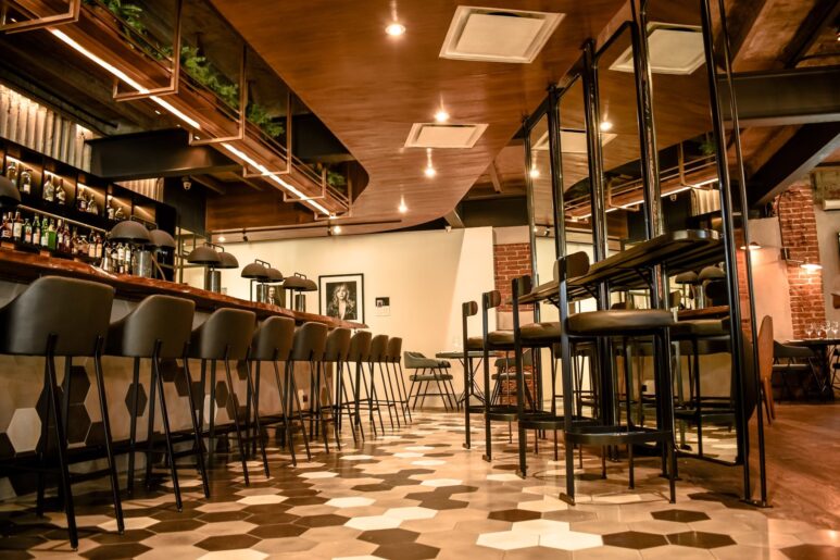 El comedor, decorado en tonos oscuros tierra, con paredes de ladrillo rojo, suelos de madera y baldosas, vigas metálicas y una cálida iluminación, respira un estilo industrial que acompaña a la perfección su propuesta culinaria.