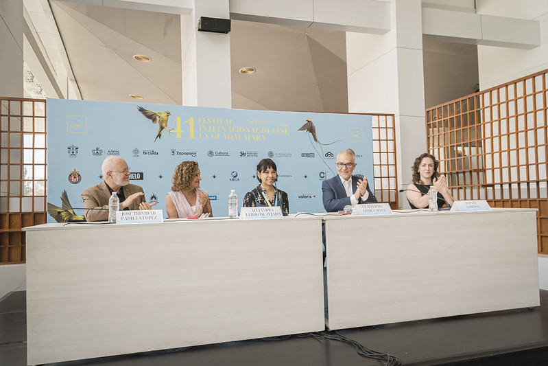 El presídium para dar a conocer la gran noticia fue conformado por Guillermo Gómez Mata, presidente del Patronato del FICG; José Trinidad Padilla López, presidente de la Fundación Universidad de Guadalajara; Sophie Gordon, representante del jurado de la Beca Jenkins-Del Toro 2026; y Alejandra Lerdo de Tejada, directora de Comunicación de la Fundación Jenkins.